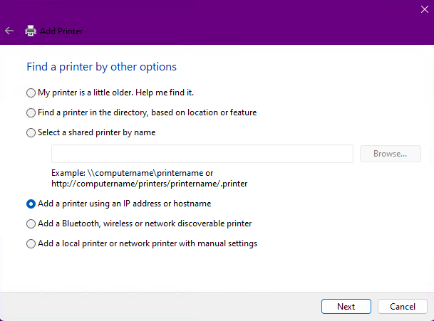 Wählen Sie die Option "Drucker unter Verwendung einer IP-Addresse oder eines Hostnamens hinzufügen" und klicken Sie auf "Weiter".