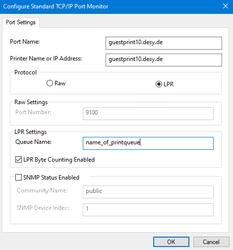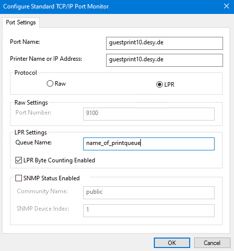 "Portname" und "Druckername oder -IP-Adresse" sind bereits vorausgefüllt. BItte die Option "LPR" auswaehlen. Unter "Warteschlangename" ist der Name der auf unsereren DESY-Printservern eingerichteten Printqueue einzutragen, an die die Druckaufträge gehen sollen. "LPR-Bytezählung aktiviert" muss aktiviert sein. Den Haken bei "SNMP-Status aktiviert" bitte nicht setzen.