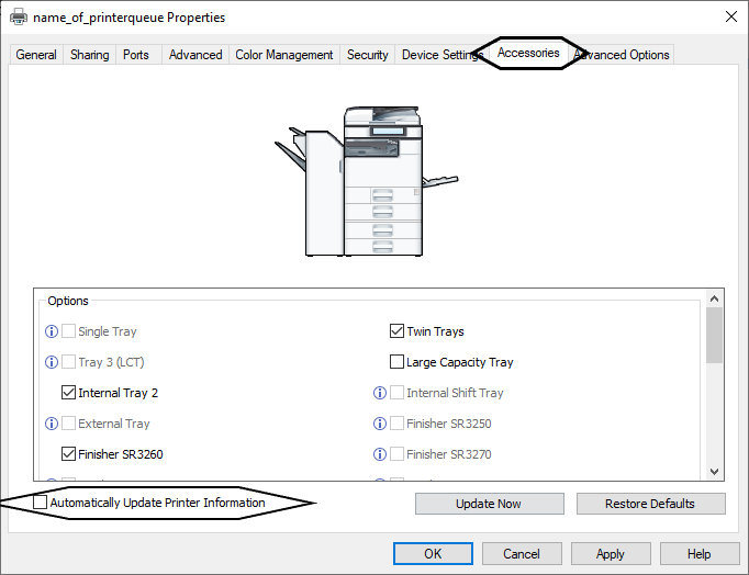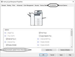 Da Ihr PC nicht direkt mit dem Drucker komunizieren kann entfernen Sie bitte den Haken unten links bei "Druckerinformationen automatisch aktualisieren". Konfigurieren Sie den Drucker nun so wie ihr Gerät ausgestattet ist, das sie ansprechen möchten.