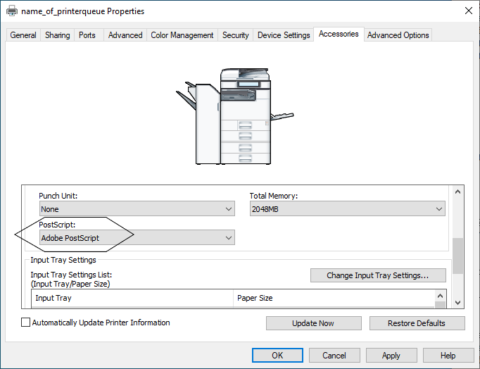 Wählen Sie bitte im "Zubehör"-Reiter neben den Ausstattungsoptionen des Gerätes bei "Postscrpt" die Option "Adobe Postscript"