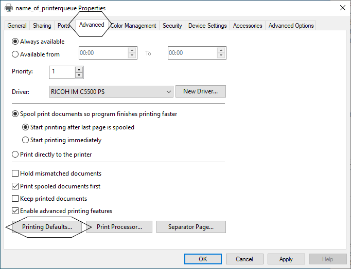 Im Reiter "Erweitert" waehlen Sie unter "Standardwerte ..." eine für Ihre Anwendungszwecke sinnvolle Standardeinstellung für Druckaufträge (Papierfach (Einzugsmagazin), Papierformat, Duplex/Simplex, Farbe/Schwarzweiß usw.).