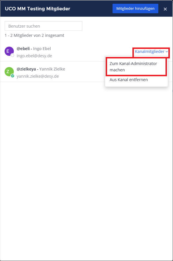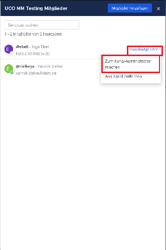 Hier können Sie nun die Mitglieder des Kanals sehen und mit einem Klick auf "Kanalmitglieder" das Aktionsmenü öffnen und jemanden "Zum Kanal-Administrator machen". (Abbildung 4)