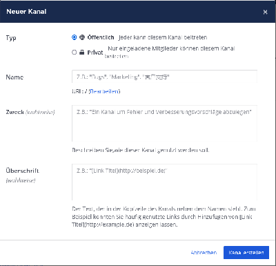 Einem "Öffentlichen" Kanal kann jeder, der Teil des Teams ist beitreten ohne eine Einladung zu benötigen. Einem "Privaten" Kanal hingegen können nur Mitglieder des Teams beitreten, die dazu eingeladen werden.