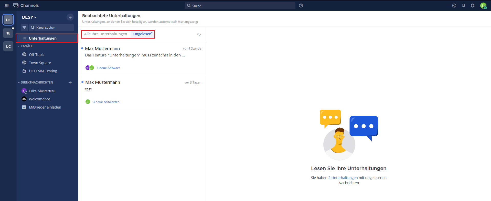 Durch einen Klick auf "Unterhaltungen" in der Navigationsleiste am linken Bildschirmrand, können Sie alle die von Ihnen verfolgten Unterhaltungen einsehen. Sie können auch nach nur ungelesenen Nachrichten Filtern. (Abbildung 4)