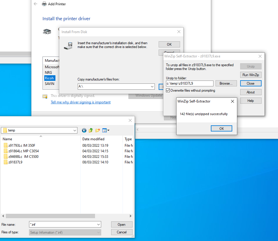 Als erstes suchen Sie bitte den passenden Treiber des Herstellers über den Link in der Druckerliste und entpacken ihn auf ihrem Windows-PC in das vorgeschlagene Verzeichnis (meist c:\tmp\<irgendwas>). Merken oder notieren Sie sich bitte das gewählte Verzeichnis.