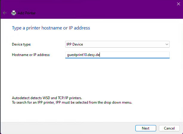 - Hostname oder IP-Adresse: guestprint10.desy.de