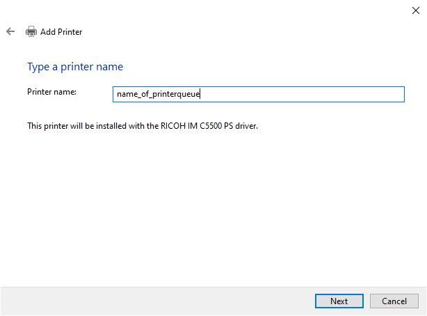 Geben Sie den gewünschten Namen des Druckers ein, wie Sie ihn bei sich in Ihrem Windows benennen wollen. Wir empfehlen den DESY-Druckernamen zu verwenden, um Verwechselungen vorzubeugen.