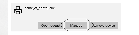 In den Windows-Systemeinstellungen finden SIe in der Liste der Drucker und Scanner den Drucker, den Sie gerade neu angelegt haben. Klicken Sie diesen an und drücken dann den Button "Verwalten". Gehen Sie anschließend bitte auf die Option "Druckereigenschaften".