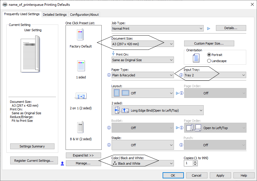 Im Reiter "Erweitert" waehlen Sie unter "Standardwerte ..." eine für Ihre Anwendungszwecke sinnvolle Standardeinstellung für Druckaufträge (Papierfach (Einzugsmagazin), Papierformat, Duplex/Simplex, Farbe/Schwarzweiß usw.).